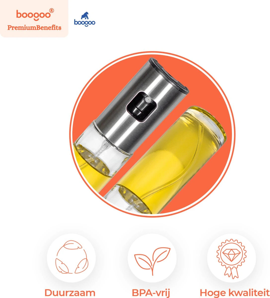 Met de Olijfolie Sprayer van BooGoo® kunt u de gewenste hoeveelheid (olijf)olie snel, eenvoudig en gelijkmatig doseren. Hierdoor wordt het bakken, braden en grillen van uw favoriete gerechten een stuk leuker, makkelijker en smaakvoller.